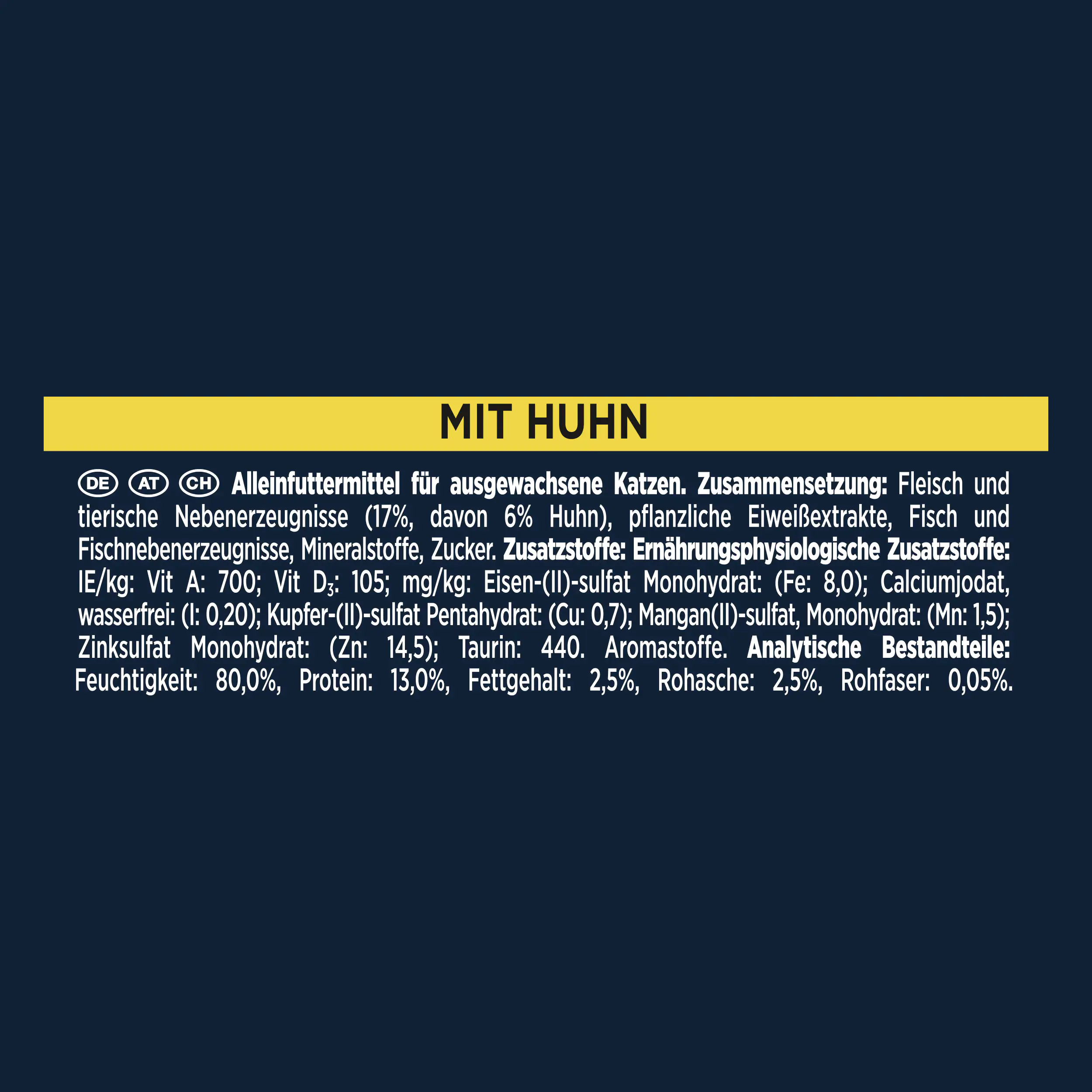 Zusammensetzung: Fleisch und tierische Nebenerzeugnisse (davon 4% Huhn), pflanzliche Eiweißextrakte, Fisch und Fischnebenerzeugnisse, Mineralstoffe, Zucker